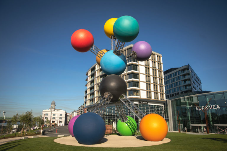 Socha Octahedral Body na predĺženej dunajskej promenáde v Eurovea City, ktorej autorom je slovenský umelec Viktor Frešo. Dielo vyhralo verejnú súťaž o vizuálne umelecké dielo, ktorú vyhlásil developer JTRE na jar minulého roka. Bratislava, 20. september 2023. Foto: SITA/Diana Černak.