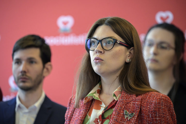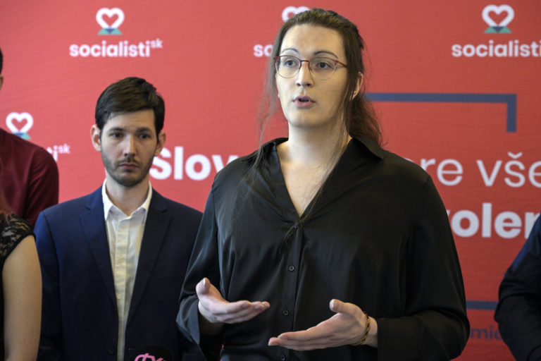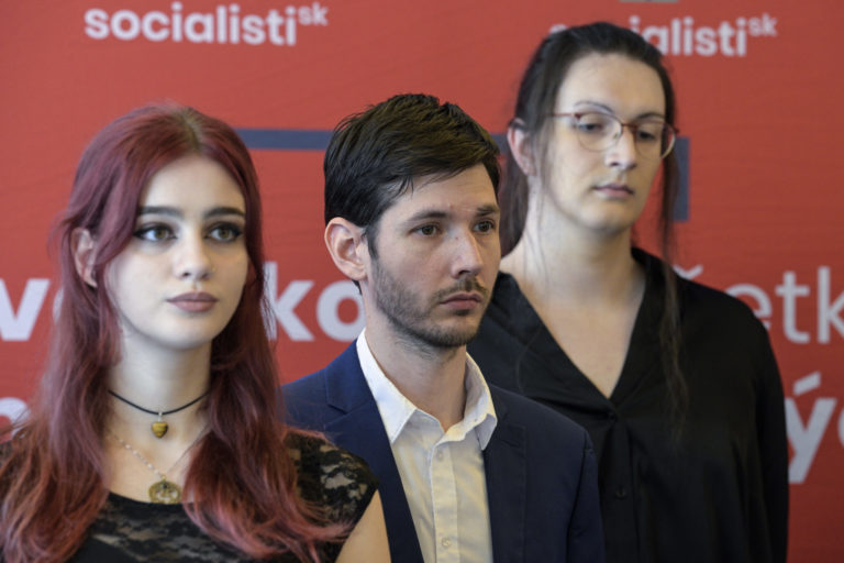 Zľava: Alexandra Aganbegovič, Artur Bekmatov a Sely Papan počas predstavenia kompletnej kandidátky hnutia Socialisti.sk do volieb do Európskeho parlamentu (EP). Bratislava, 9. apríl 2024. Foto: SITA/Milan Illík