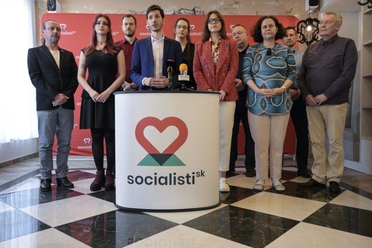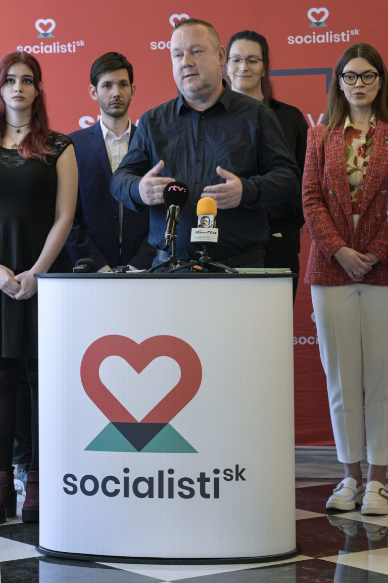 Zľava: Artur Bekmatov a Tomáš Schroll počas predstavenia kompletnej kandidátky hnutia Socialisti.sk do volieb do Európskeho parlamentu (EP). Bratislava, 9. apríl 2024. Foto: SITA/Milan Illík