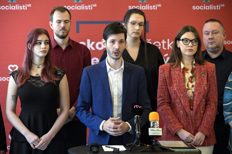 Zľava: Artur Bekmatov, Lucia Hubinská a Selly Papan počas predstavenia kompletnej kandidátky hnutia Socialisti.sk do volieb do Európskeho parlamentu (EP). Bratislava, 9. apríl 2024. Foto: SITA/Milan Illík