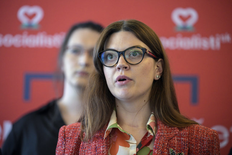 Zľava: Sely Papan a Lucia Hubinská počas predstavenia kompletnej kandidátky hnutia Socialisti.sk do volieb do Európskeho parlamentu (EP). Bratislava, 9. apríl 2024. Foto: SITA/Milan Illík