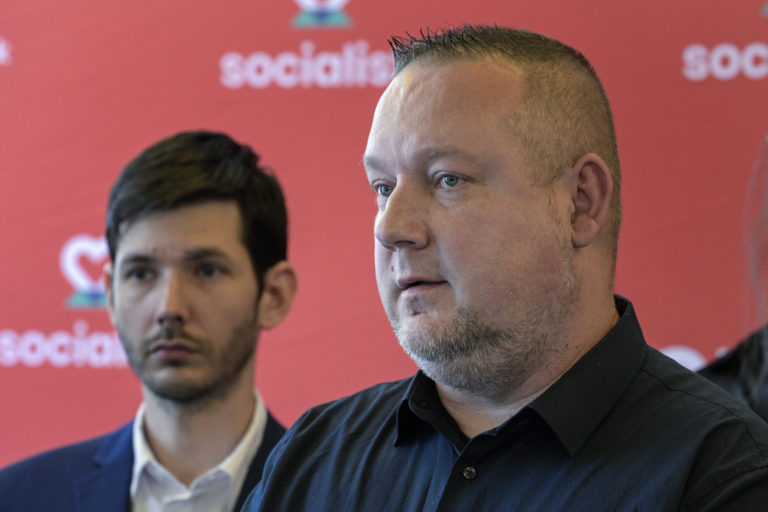 Zľava: Artur Bekmatov a Sely Papan počas predstavenia kompletnej kandidátky hnutia Socialisti.sk do volieb do Európskeho parlamentu (EP). Bratislava, 9. apríl 2024. Foto: SITA/Milan Illík