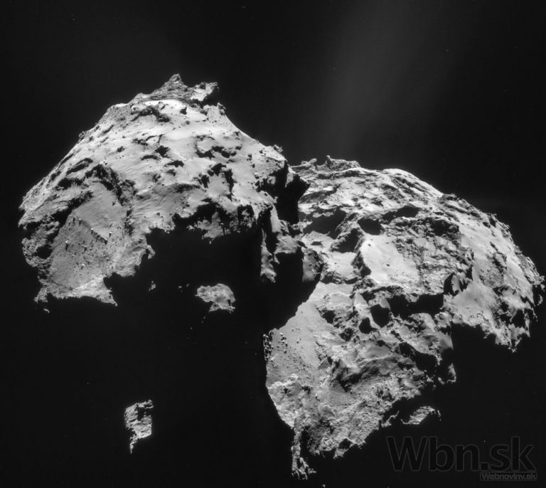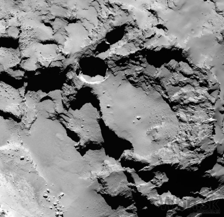 Snímka vytvorená sondou Rosetta zo vzdialenosti 9,8 kilometra od centra Kométy 67P/Churyumov–Gerasimenko zachytáva vyvýšenú plošinu kométy. (12. novembra 2014) Foto: SITA/AP Photo