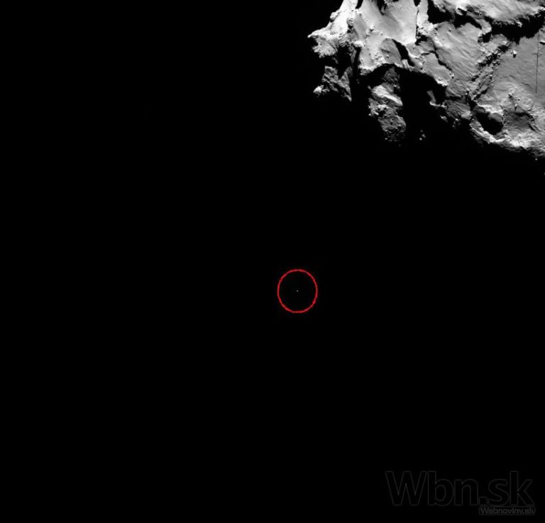Fotografia názorne ukazuje ako sa pristávací Philae oddľuje od materskej sondy Rosetta a zostupuje na povrch Kométy 67P/Churyumov-Gerasimenko. (12. novembra 2014) Foto: SITA/AP Photo