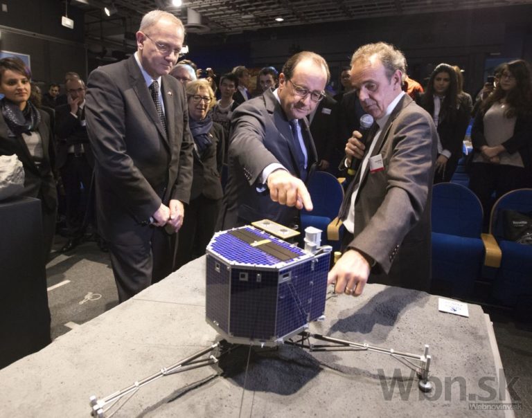 Francúzsky prezident Francois Hollande (v strede) a francúzsky astrofyzik Francis Rocard hľadia na model Rosetty Philae. Foto: SITA/ AP