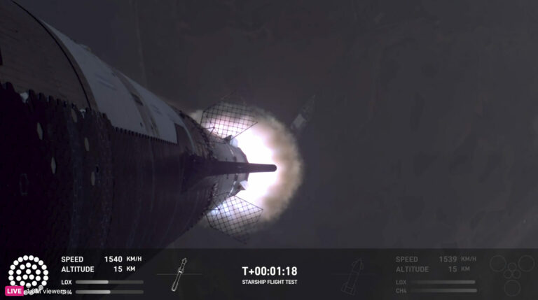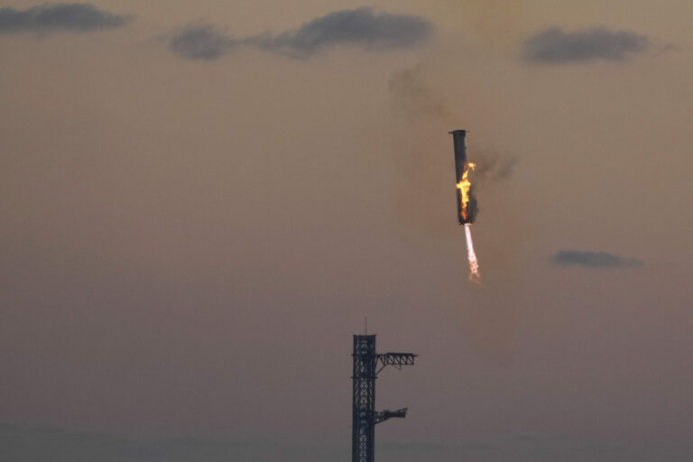Spoločnosti SpaceX miliardára Elona Muska sa v nedeľu podaril mimoriadny technický počin, keď pri teste rakety Starship jej vracajúci sa prvý stupeň zachytili na štartovacej rampe veľké mechanické ramená. Foto: SpaceX via AP.