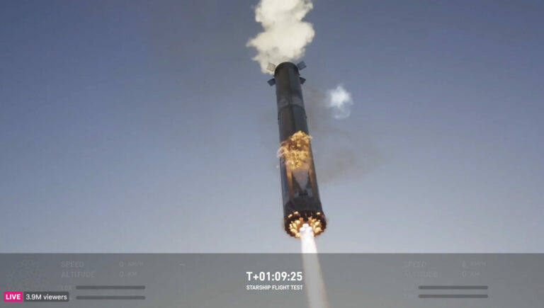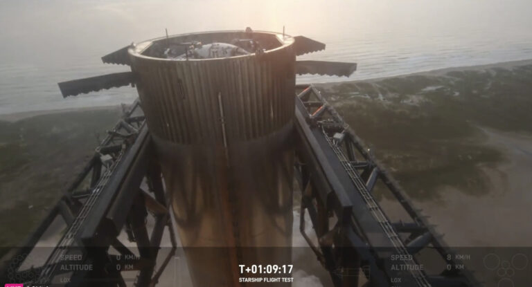 Spoločnosti SpaceX miliardára Elona Muska sa v nedeľu podaril mimoriadny technický počin, keď pri teste rakety Starship jej vracajúci sa prvý stupeň zachytili na štartovacej rampe veľké mechanické ramená. Foto: SITA/AP.