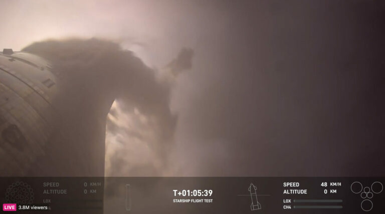 This image provided by SpaceX shows smoke and fire from SpaceX's mega Starship rocket after landing in the water in the Indian Ocean after returning during a test flight, Sunday, Oct. 13, 2024. (SpaceX via AP)