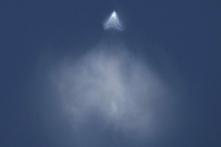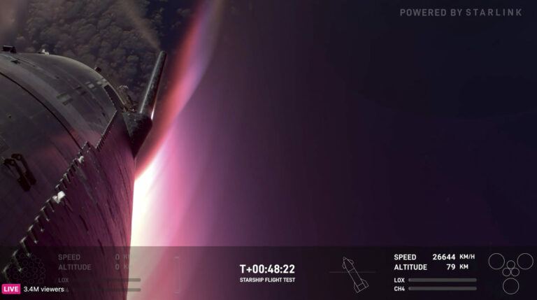 This image provided by SpaceX shows SpaceX's mega Starship rocket returning during a test flight, Sunday, Oct. 13, 2024, over Boca Chica, Texas. (SpaceX via AP)