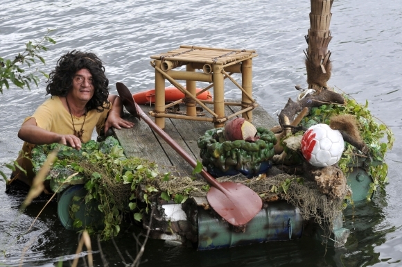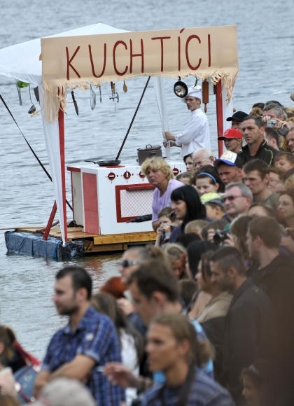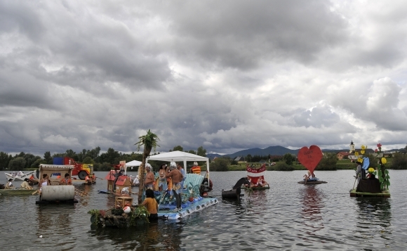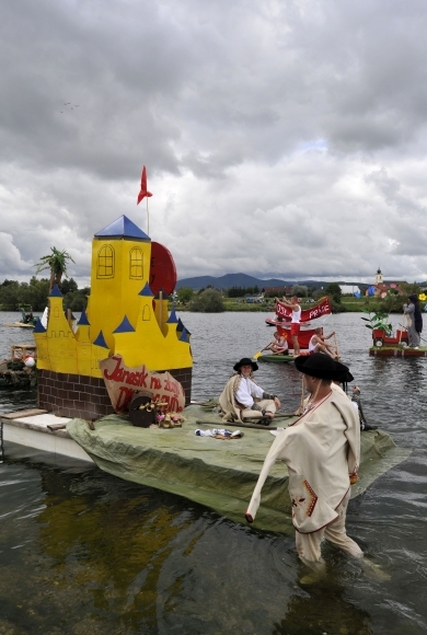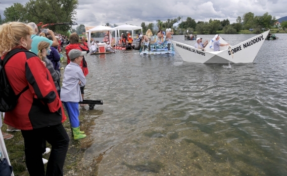 Splav netradičných korábov pod názvom SPLANEKOR 2012, sa v sobotu konal v Trenčíne na Ostrove. Po rieke Váh sa plavili po domácky vyrobené, humorne ladené plavidlá s posádkou oblečenou v kostýmoch dotvárajúcich hlavnú myšlienku plavidla. Trenčín, 11. august 2012. Foto: SITA/Tomáš Somr