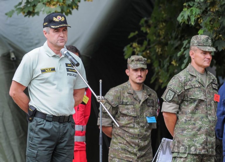 Prezident Policajného zboru SR Tibor Gašpar (vľavo) počas príhovoru po skončení spoločného cvičenia príslušníkov Ozbrojených síl SR a Ministerstva vnútra SR Nový horizont 2015 v priestoroch 12. mechanizovaného práporu v Krškanoch v Nitre a vo Výcvikovom priestore Kolíňanský vrch. Cieľom cvičenia bol spoločný postup v prípade prílevu masívnej vlny utečencov z územia susedného štátu. Nitra, 30. júl 2015. Foto: SITA/Martin Havran