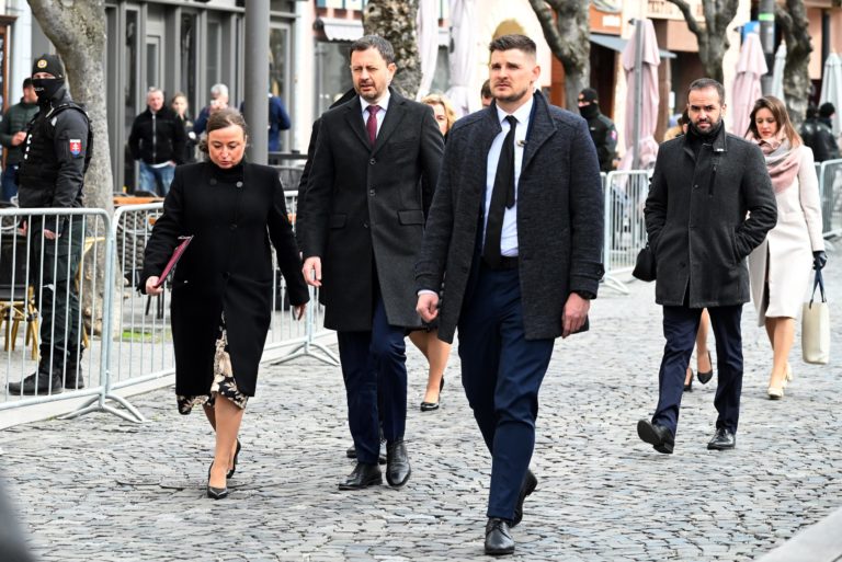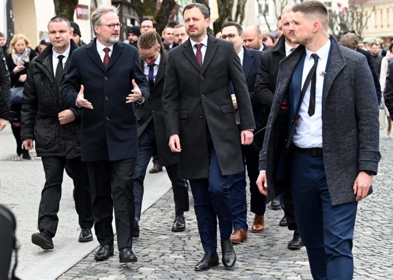 Dočasne poverený predseda vlády SR Eduard Heger (druhý zľava) prichádza na uvítací ceremoniál pred spoločným zasadnutím členov vlád Slovenskej republiky a Českej republiky v Trenčíne. Trenčín, 3. apríl 2023. Foto: SITA/Tomáš Somr