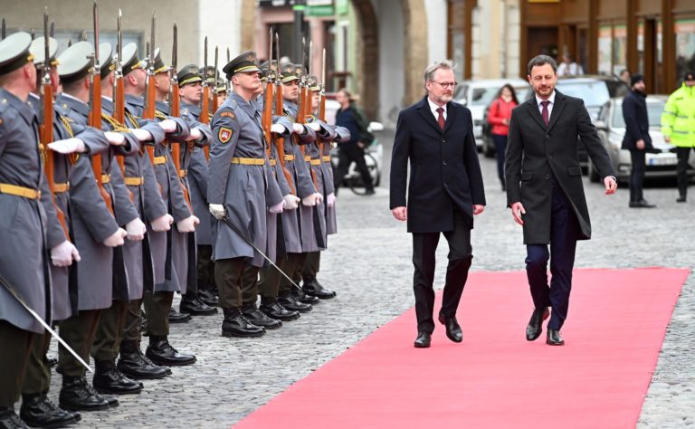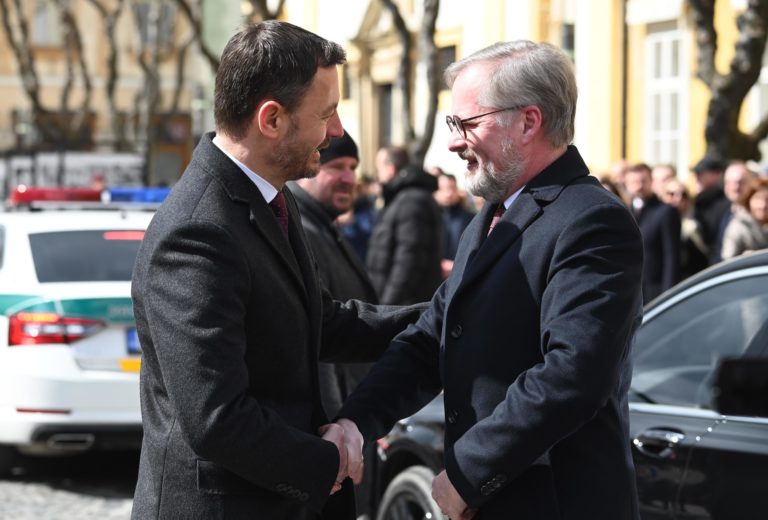 Sprava v popredí: Dočasne poverený predseda vlády SR Eduard Heger a predseda vlády ČR Petr Fiala počas uvítacieho ceremoniálu pred spoločným zasadnutím členov vlád Slovenskej republiky a Českej republiky v Trenčíne. Trenčín, 3. apríl 2023. Foto: SITA/Tomáš Somr
