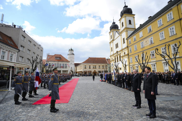 Dočasne poverený predseda vlády SR Eduard Heger (v popredí, druhý sprava) a predseda vlády ČR Petr Fiala (v popredí druhý zľava) počas uvítacieho ceremoniálu pred spoločným zasadnutím členov vlád Slovenskej republiky a Českej republiky v Trenčíne. Trenčín, 3. apríl 2023. Foto: SITA/Tomáš Somr