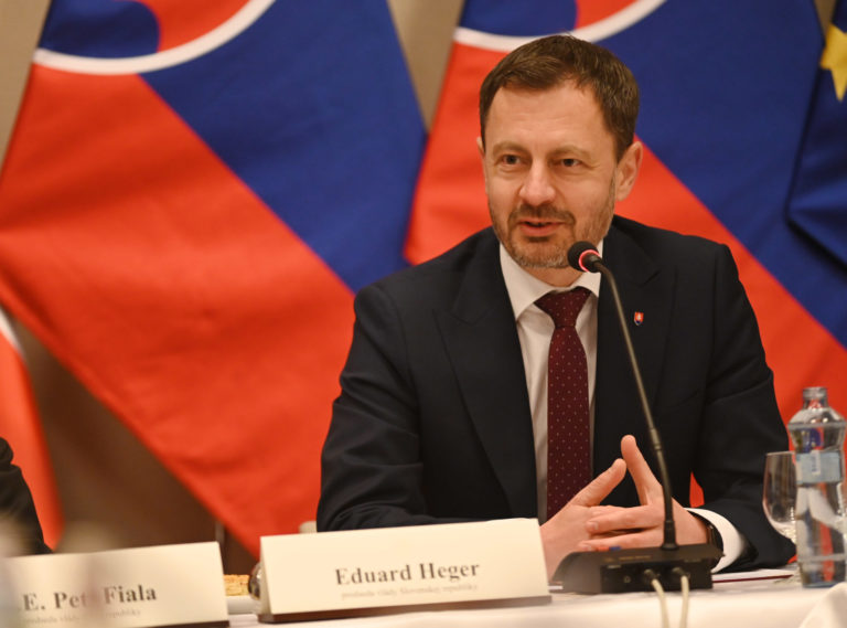 Dočasne poverený predseda vlády SR Eduard Heger počas spoločného rokovania členov vlád Slovenskej republiky a Českej republiky v Trenčíne. Trenčín, 3. apríl 2023. Foto: SITA/Tomáš Somr