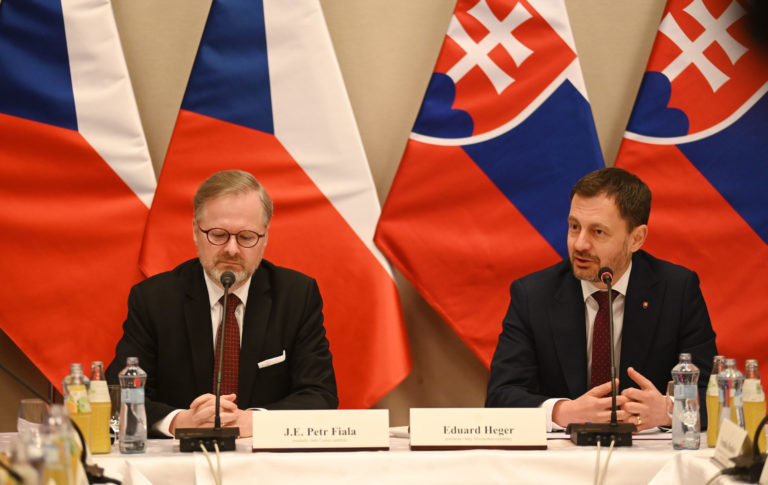 Sprava: Dočasne poverený predseda vlády SR Eduard Heger a predseda vlády ČR Petr Fiala počas spoločného rokovania členov vlád Slovenskej republiky a Českej republiky v Trenčíne. Trenčín, 3. apríl 2023. Foto: SITA/Tomáš Somr