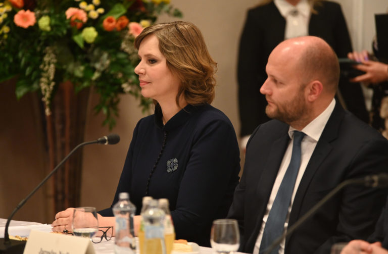 Zľava: Dočasne poverená ministerka investícií, regionálneho rozvoja a informatizácie SR Veronika Remišová a dočasne poverený minister obrany SR Jaroslav Naď počas spoločného rokovania členov vlád Slovenskej republiky a Českej republiky v Trenčíne. Trenčín, 3. apríl 2023. Foto: SITA/Tomáš Somr