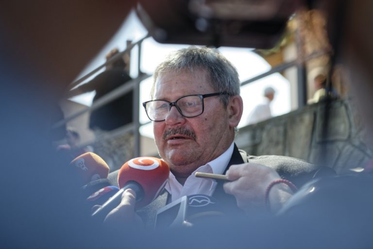 Otec Jána Kuciaka Jozef Kuciak počas vyjadrenia pre médiá po svätej omši v miestnom kostole Narodenia Panny Márie, ktorá sa konala v rámci spomienky na zavraždených Martinu a Jána v deň ich plánovaného sobáša. Gregorovce, 5. máj 2018. Foto: SITA/Ivan Fleischer