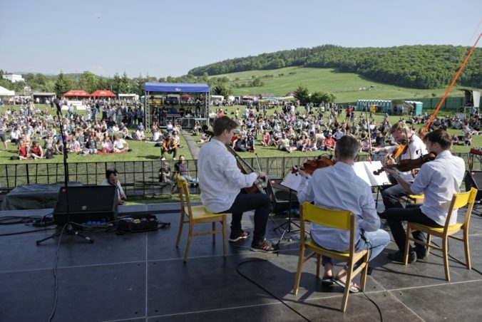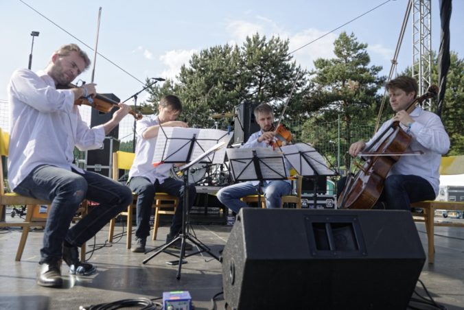 Zoskupenie Konvergencie Quartet počas vystúpenia na spomienkovom koncerte pre zavraždených Martinu a Jána na futbalovom ihrisku v Gregorovciach v deň ich plánovaného sobáša. Gregorovce, 5. máj 2018. Foto: SITA/Ivan Fleischer
