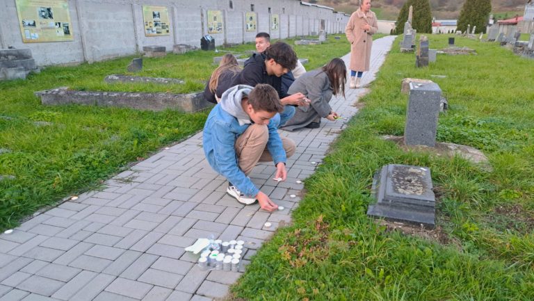 Študenti gymnázia zapaľujú sviečky na židovskom cintoríne v Spišskej Novej Vsi v rámci spomienky na detské obete holokaustu. Spišská Nová Ves, 2. novembra 2023. Foto: SITA/Mária Frisová