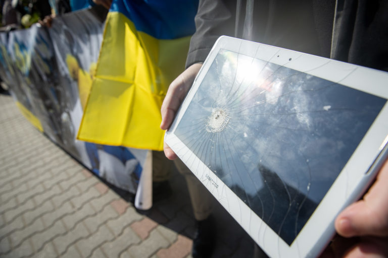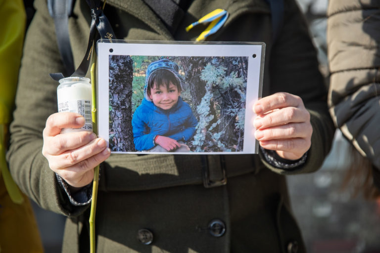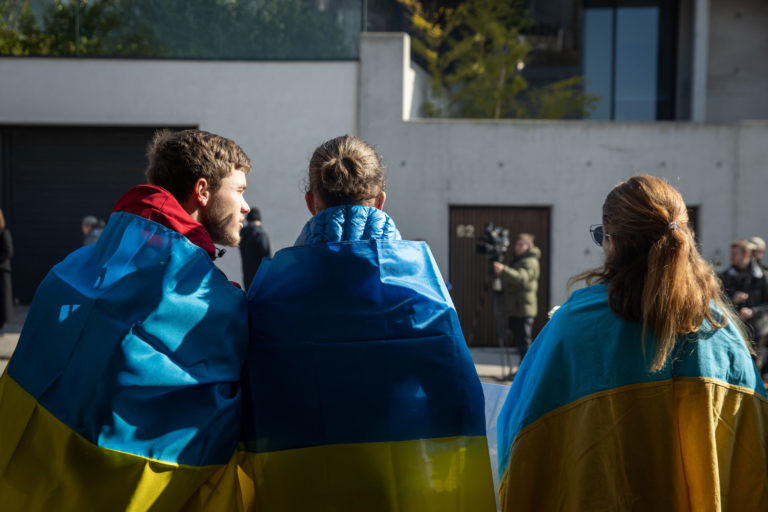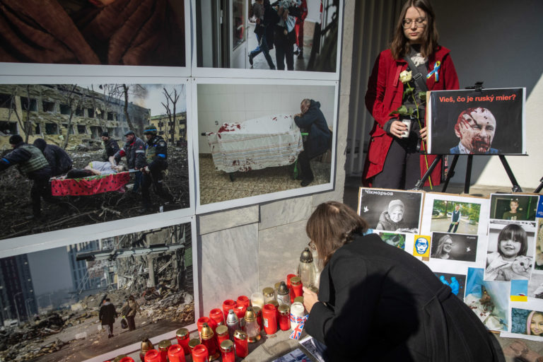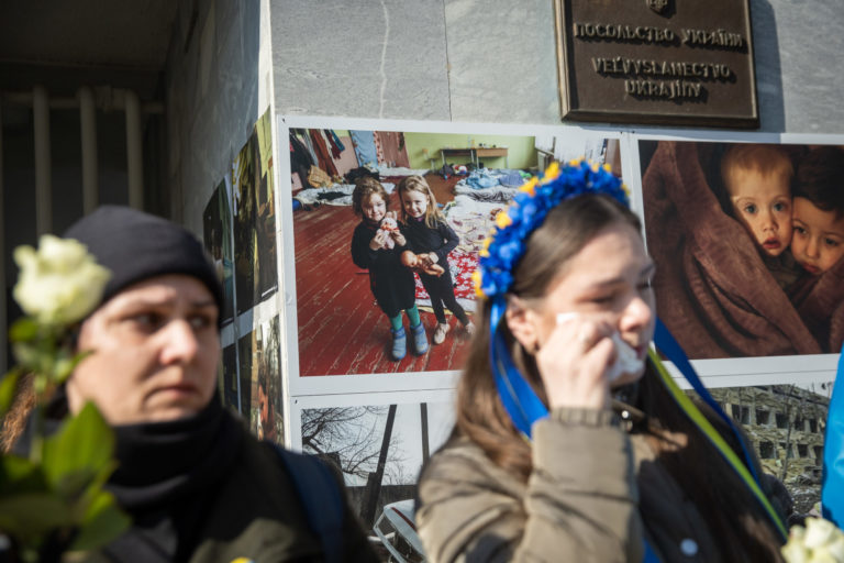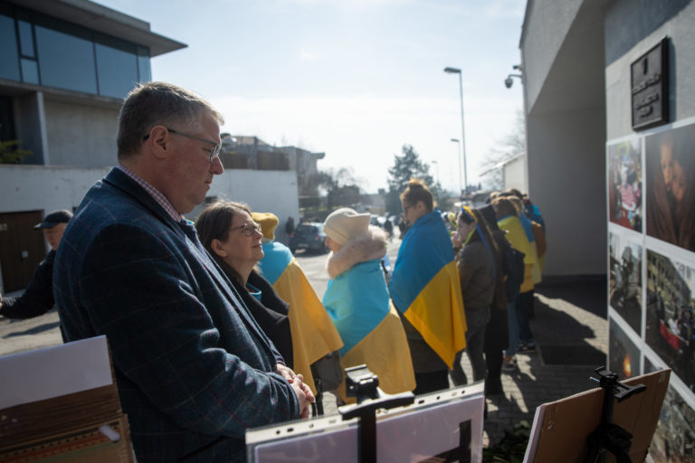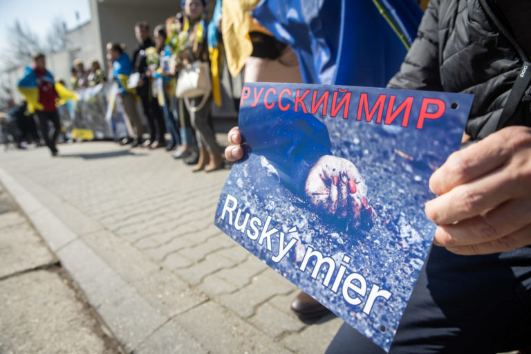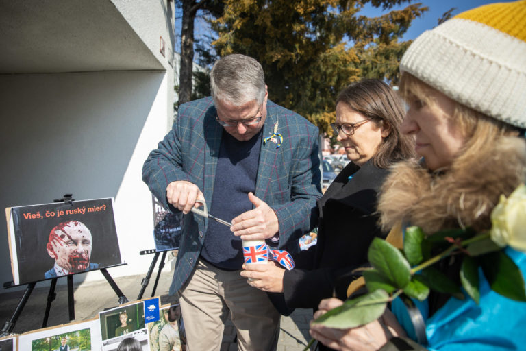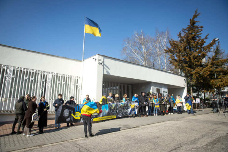 Účastníci spomienkovej udalosti ktorú organizuje Iniciatíva Mier Ukrajine za obete masakru v meste Buča rok od tejto udalosti pred ukrajinskou ambasádou v Bratislave. Bratislava, 3. marec 2023. Foto: SITA/Diana Černáková