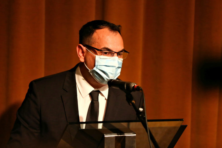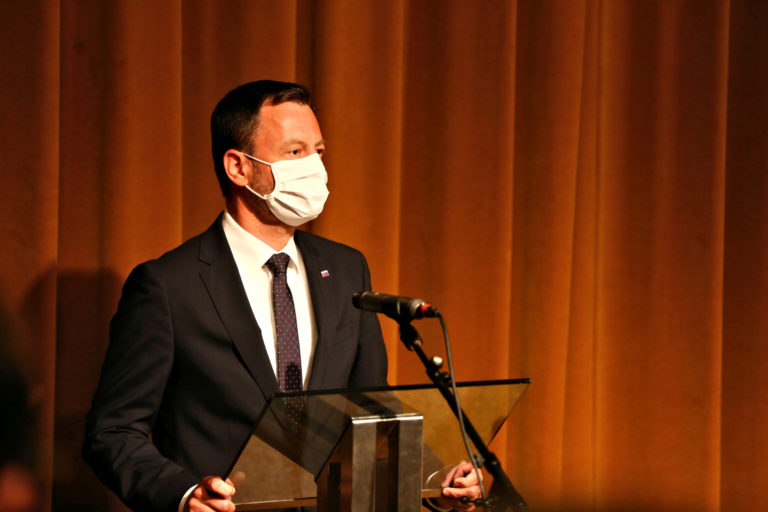Predseda vlády SR Eduard Heger v príhovore počas spomienkového podujatia pri príležitosti Pamätného dňa rómskeho holokaustu v Múzeu SNP v Banskej Bystrici. Banská Bystrica, 1. august 2021. Foto: SITA/Peter Rusko