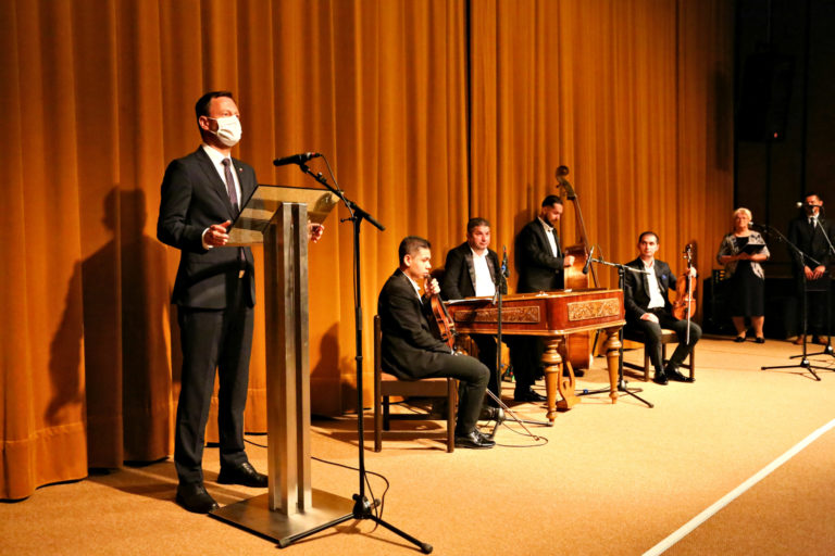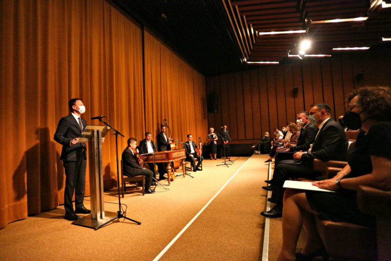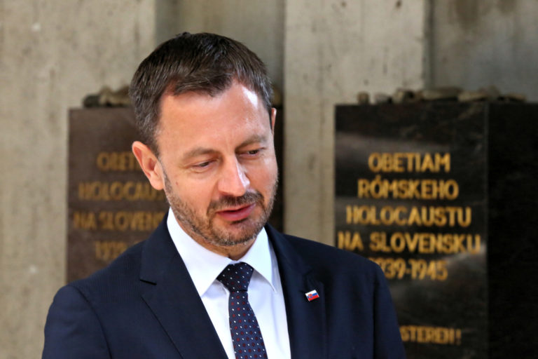 Predseda vlády SR Eduard Heger (vľavo) v príhovore počas spomienkového podujatia pri príležitosti Pamätného dňa rómskeho holokaustu v Múzeu SNP v Banskej Bystrici. Banská Bystrica, 1. august 2021. Foto: SITA/Peter Rusko