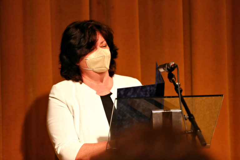 Slovenská verejná ochrankyňa práv Mária Patakyová v príhovore počas spomienkového podujatia pri príležitosti Pamätného dňa rómskeho holokaustu v Múzeu SNP v Banskej Bystrici. Banská Bystrica, 1. august 2021. Foto: SITA/Peter Rusko