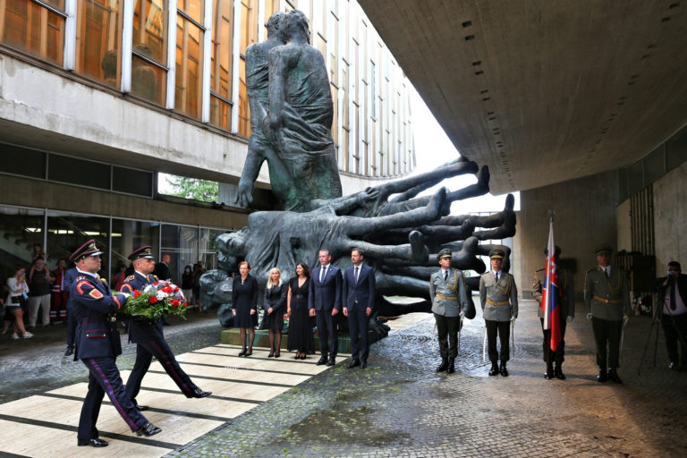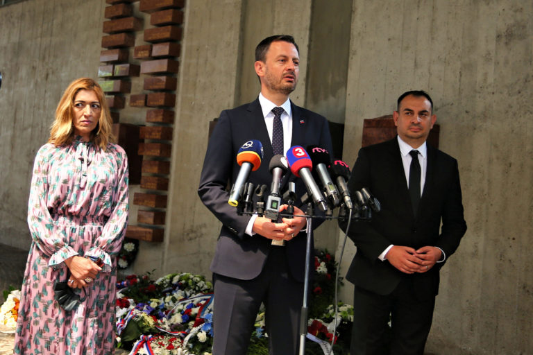 Uprostred sprava: Predseda vlády SR Eduard Heger a minister vnútra SR Roman MIkulec počas spomienkového podujatia pri príležitosti Pamätného dňa rómskeho holokaustu v Múzeu SNP v Banskej Bystrici. Banská Bystrica, 1. august 2021. Foto: SITA/Peter Rusko