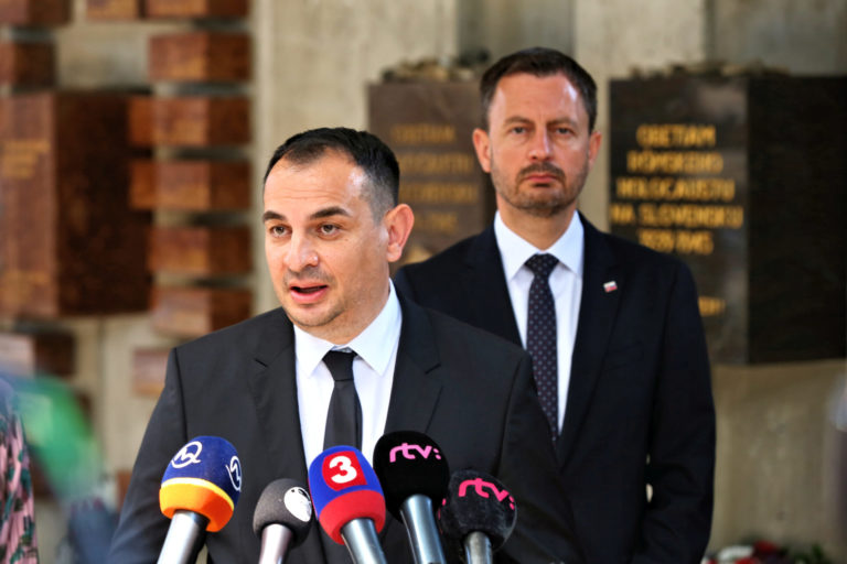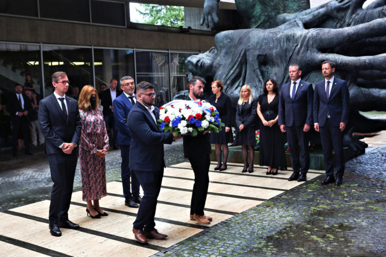 Sprava: Predseda vlády SR Eduard Heger a minister vnútra SR Roman Mikulec počas spomienkového podujatia pri príležitosti Pamätného dňa rómskeho holokaustu v Múzeu SNP v Banskej Bystrici. Banská Bystrica, 1. august 2021. Foto: SITA/Peter Rusko