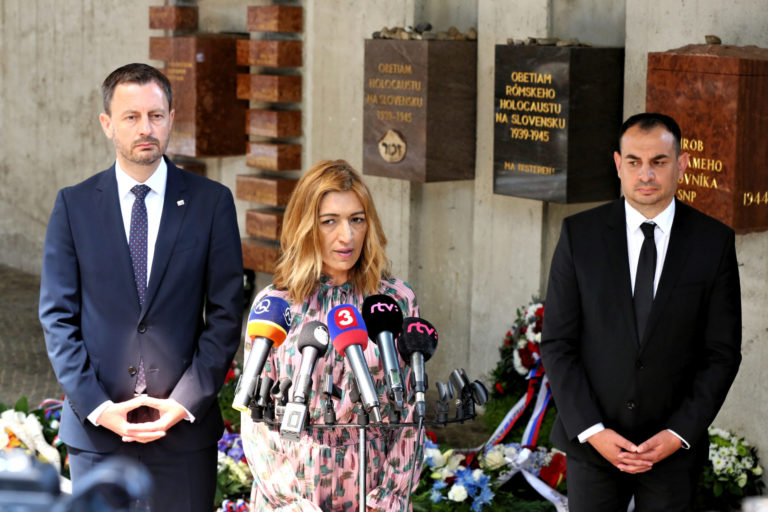 Zľava: Predseda vlády SR Eduard Heger, splnomocnenkyňa vlády SR pre rómske komunity Andrea Bučková a poslanec Európskeho parlamentu Peter Pollák starší počas spomienkového podujatia pri príležitosti Pamätného dňa rómskeho holokaustu v Múzeu SNP v Banskej Bystrici. Banská Bystrica, 1. august 2021. Foto: SITA/Peter Rusko
