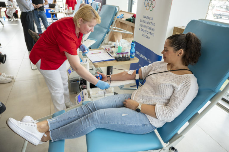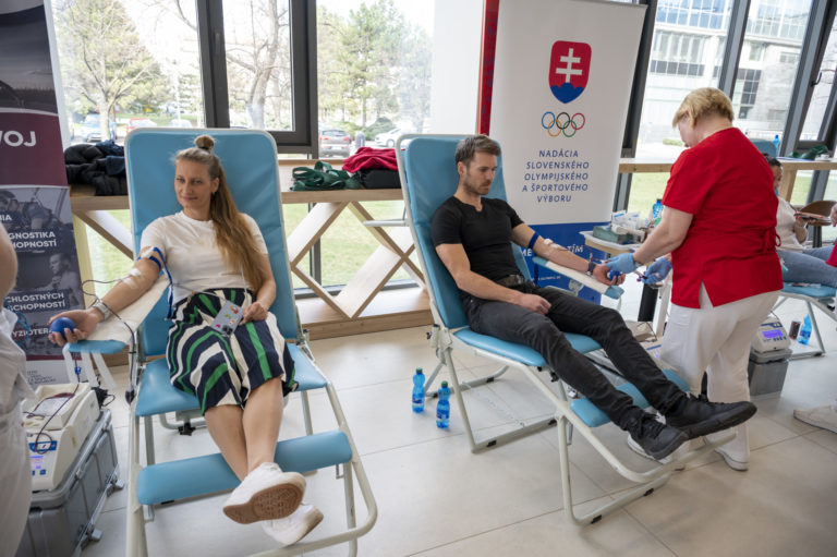 Zľava: Atlétka Rebeka Žibritová a olympijský medailista v džude Jozef Krnáč počas športovej kvapky krvi v Olympijskom centre v Dome športu v Bratislave. Bratislava, 21. február 2024. Foto: SITA/Milan Illík