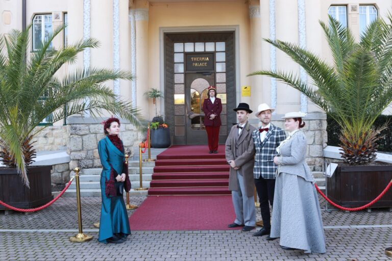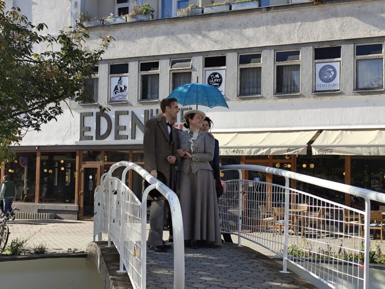 Počas komentovanej prechádzky Piešťany podľa Wintera ožíva zásluhou hercov pred očami aj v slúchadlách účastníkov zaujímavý, a zároveň smutný príbeh tohto výnimočného človeka a zakladateľa piešťanských kúpeľov. Foto: SITA/Milota Mezeiová
