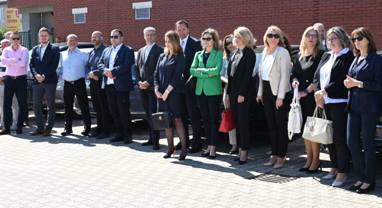Účastníci počas slávnostného otvorenia nových elektrických nabíjačiek pre automobily v areáli spoločnosti Slovenský plynárenský priemysel (SPP) v Košiciach. Košice, 16. máj 2024. Foto: SITA/Viktor Zamborský.