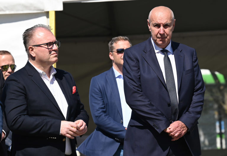 V popredí zľava: Predseda predstavenstva a generálny riaditeľ SPP Vojtech Ferencz a generálny riaditeľ spoločnosti Siemens Slovensko Vladimír Slezák počas otvorenia nových elektrických nabíjačiek pre automobily v areáli spoločnosti Slovenský plynárenský priemysel (SPP) v Košiciach. Košice, 16. máj 2024. Foto: SITA/Viktor Zamborský.