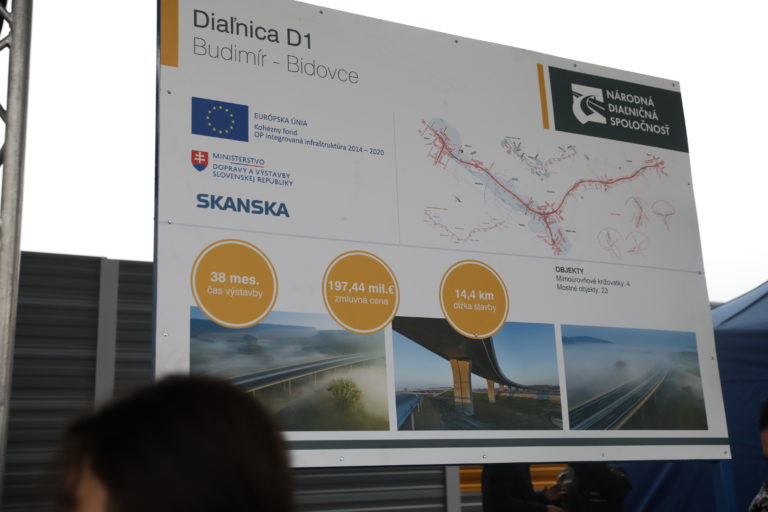 Informačná tabuľa počas brífingu po sprejazdnení úseku D1 Budimír - Bidovce za účasti ministra dopravy a výstavby, generálneho riaditeľa NDS a ďalších hostí. Košice, 16. december 2019. Foto: SITA/Marek Lukáč