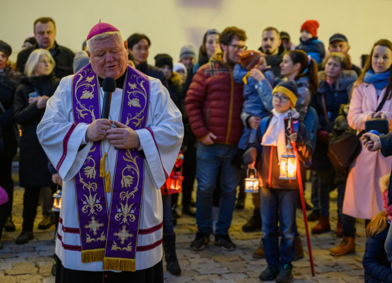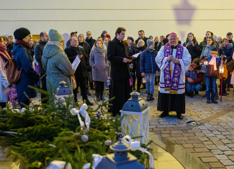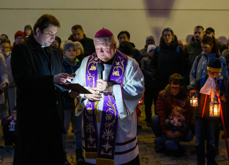 Nitriansky biskup Viliam Judák (uprostred) požehnal adventný veniec a zažal na ňom prvú sviecu počas sprievodu svetla Via Noce z Nitrianskeho hradu do centra mesta, ktorý v rámci prvej adventnej nedele pripravilo Nitrianske biskupstvo v spolupráci s mestom. Nitra, 27. november 2022. Foto: SITA/Martin Havran