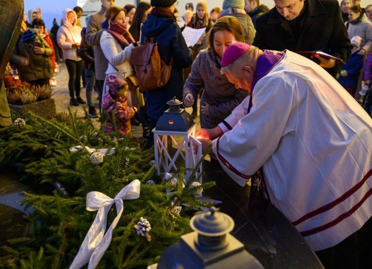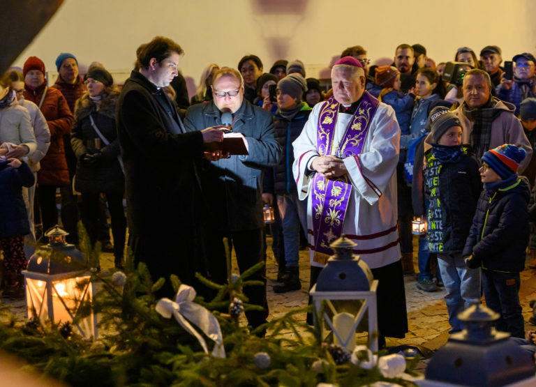 Nitriansky biskup Viliam Judák (vľavo) požehnal adventný veniec a zažal na ňom prvú sviecu počas sprievodu svetla Via Noce z Nitrianskeho hradu do centra mesta, ktorý v rámci prvej adventnej nedele pripravilo Nitrianske biskupstvo v spolupráci s mestom. Nitra, 27. november 2022. Foto: SITA/Martin Havran