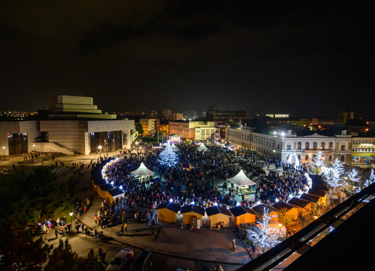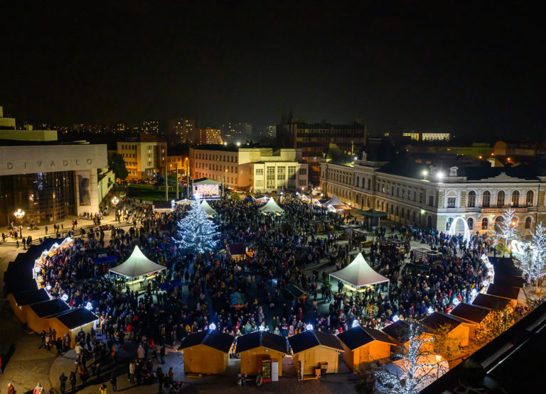 Rozsvietený vianočný stromček na Svätoplukovom námestí v Nitre počas prvej adventnej nedele. Nitra, 27. november 2022. Foto: SITA/Martin Havran