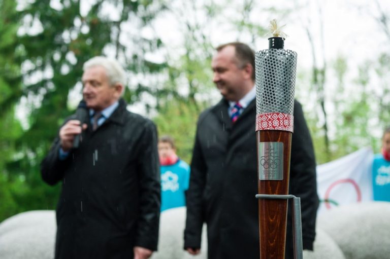 Pochodeň Slovenského olympijského výboru počas štartu slovenskej olympijskej Štafety Rio 2016 pri Národnom pamätníku olympionikov na Národnom cintoríne v Martine. Na snímke zľava: Prezident Slovenského olympijského výboru František Chmelár počas príhovoru a viceprimátor mesta Martin Imrich Žigo. Martin, 27. apríl 2016. Foto: SITA/Milo Fabian