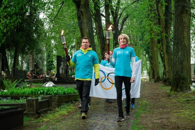 Atlétka Lucia Hrivná Klocová (vľavo) a olympionik i vodný slalomár Michal Martikán (vpravo) s pochodňami počas štartu slovenskej olympijskej Štafety Rio 2016 pri Národnom pamätníku olympionikov na Národnom cintoríne v Martine. Martin, 27. apríl 2016. Foto: SITA/Milo Fabian