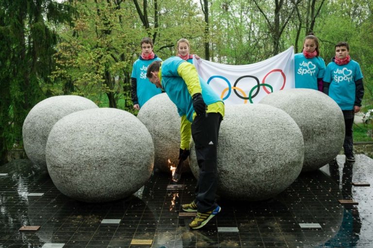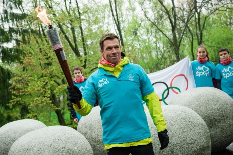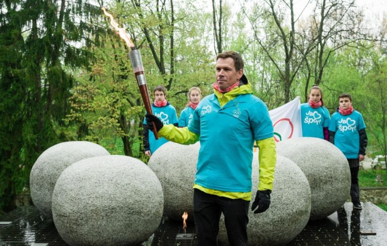 Olympionik a vodný slalomár Michal Martikán s pochodňou počas štartu slovenskej olympijskej Štafety Rio 2016 pri Národnom pamätníku olympionikov na Národnom cintoríne v Martine. Martin, 27. apríl 2016. Foto: SITA/Milo Fabian