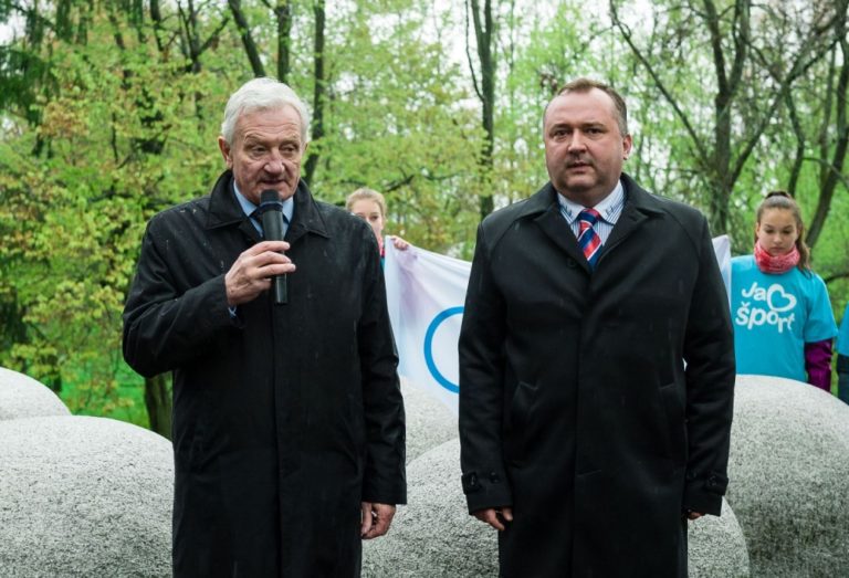 Prezident Slovenského olympijského výboru František Chmelár (vľavo) a viceprimátor mesta Martin Imrich Žigo (vpravo) počas príhovoru pred štartom slovenskej olympijskej Štafety Rio 2016 pri Národnom pamätníku olympionikov na Národnom cintoríne v Martine. Martin, 27. apríl 2016. Foto: SITA/Milo Fabian