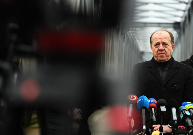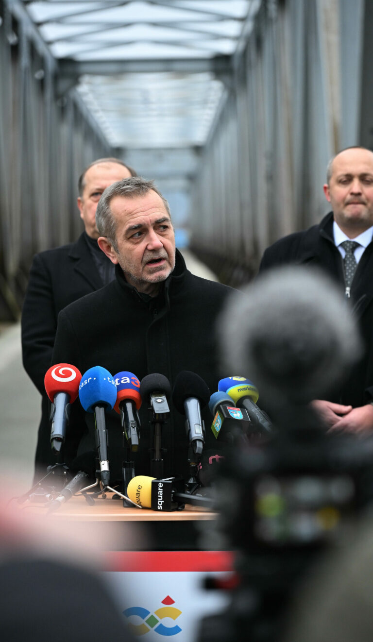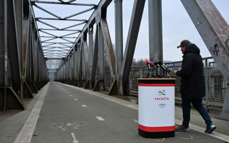 Primátor mesta Trenčín Richard Rybníček počas tlačového brífingu pred začatím prestavby starého železničného mosta v Trenčíne na dvojpodlažný promenádny a pobytový zelený Fiesta most. Trenčín, 23. január 2025. Foto: SITA/Tomáš Somr