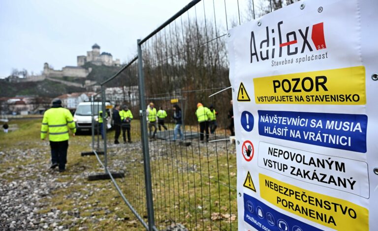 Robotníci oplocujú okolie starého železničného mosta v Trenčíne pred začatím jeho prestavby na dvojpodlažný promenádny a pobytový zelený Fiesta most. Trenčín, 23. január 2025. Foto: SITA/Tomáš Somr