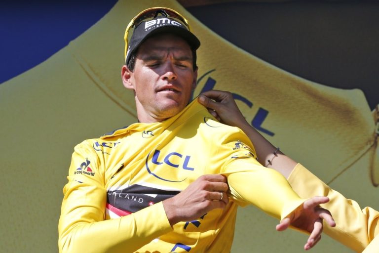 Belgičan Greg van Avermaet na stupni víťazov v žltom drese po siedmej etape Tour de France, ktorá viedla z L´Isle-Jourdain do Lac de Payolle a merala 162,5 kilometrov. Foto: SITA/AP