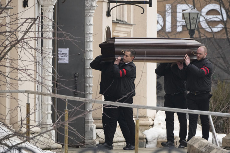 Pracovníci pohrebnej služby nesú rakvu a portrét vodcu ruskej opozície Alexeja Navaľného z moskovského kostola v Rusku. Foto: SITA/AP.