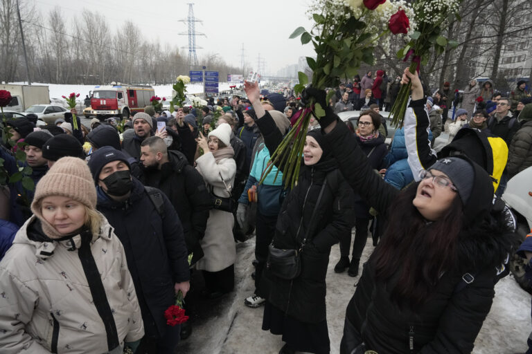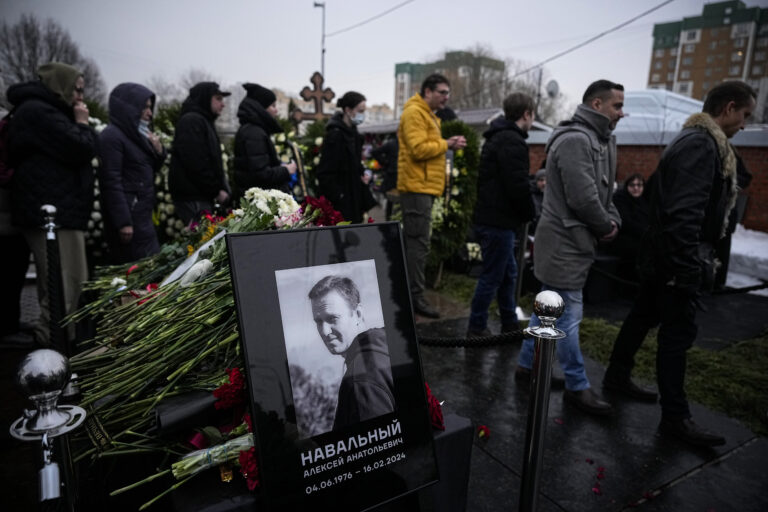 Stovky ľudí si prišli k Borisovskému cintorínu uctiť ruského opozičného lídra Alexeja Navaľného, kde sa koná jeho pohreb. Foto: SITA/AP.