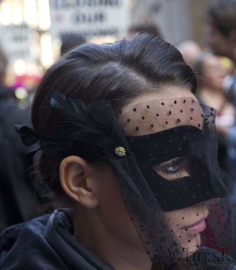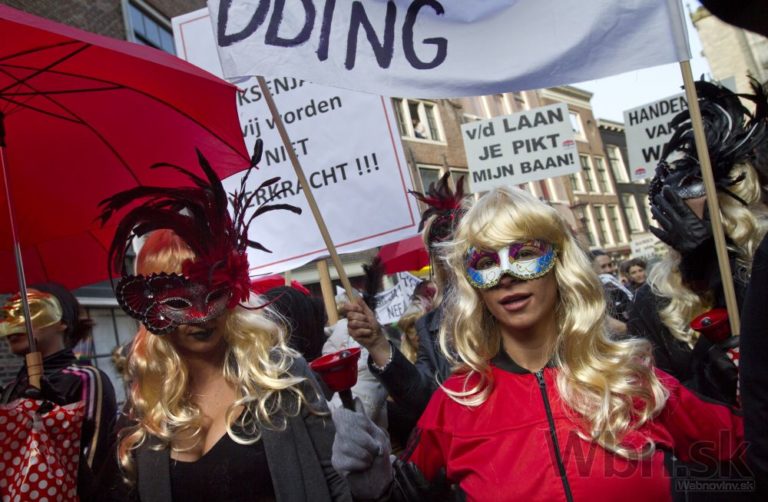 Protestanti, ktorých väčšina mala zahalené tváre, pochodovali k budove magistrátu, kde odovzdali petíciu za zachovanie výkladov v časti mesta známej ako De Wallen alebo Rosse Buurt. Foto: SITA/ AP
