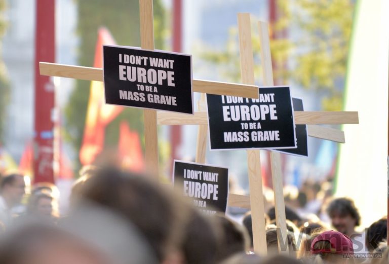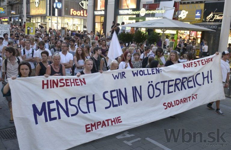 Demonštranti, ktorí protestovali vo Viedni, vítali utečencov s plagátmi. Foto: SITA/AP